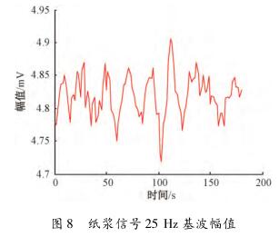 在頻域中對紙漿信號觀察時發(fā)現(xiàn),紙漿信號的漿液噪聲頻帶在零頻率點附近,距離流量信號基波頻率點較遠(yuǎn),對基波幅值和各奇次諧波幅值基本沒有影響,紙漿信號在頻域中的圖形如圖7所示。選擇一組采集的紙漿信號,把其等分成數(shù)段,利用MATLAB計算每段數(shù)據(jù)在基波處的幅值并提取保存在一個數(shù)組中,使用繪圖工具畫出來,如圖8所示。可見,基波幅值在4.7~4.95mV變化,波動較小。因此,提取到的與流量相關(guān)的感應(yīng)電動勢信號幅值會比較穩(wěn)定。