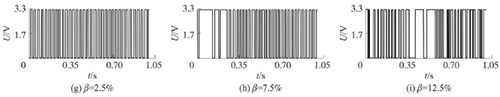 試驗(yàn)發(fā)現(xiàn),氣相的加入對(duì)乙烯流量計(jì)測(cè)量的影響顯著,譜分析和脈沖計(jì)數(shù)兩種方法隨著氣相注入的增加其表現(xiàn)也不同。圖4反映了水流量12m3/h時(shí),注入不同氣含率β時(shí)A點(diǎn)的模擬信號(hào),如圖4(a~c)所示;經(jīng)譜分析后得到的頻率值,如圖4(d~f)所示;用脈沖計(jì)數(shù)方法得到的脈沖信號(hào),如圖4(g~i)所示。圖4顯示,當(dāng)注入氣量不大時(shí),對(duì)乙烯流量計(jì)的影響不大,無論是譜分析結(jié)果還是脈沖計(jì)數(shù)得到的結(jié)果都比較好。當(dāng)注入的氣量進(jìn)一步增加時(shí),渦街原始信號(hào)強(qiáng)度和穩(wěn)定性逐漸變差,渦街頻率信號(hào)會(huì)被干擾信號(hào)所淹沒,反映到譜分析圖是,渦街頻率的譜能量減小,干擾信號(hào)的譜能量加強(qiáng);對(duì)于脈沖信號(hào),會(huì)因?yàn)橐恍┬郎u信號(hào)減弱,形成脈沖缺失現(xiàn)象,而不能真實(shí)地反映渦街產(chǎn)生的頻率。